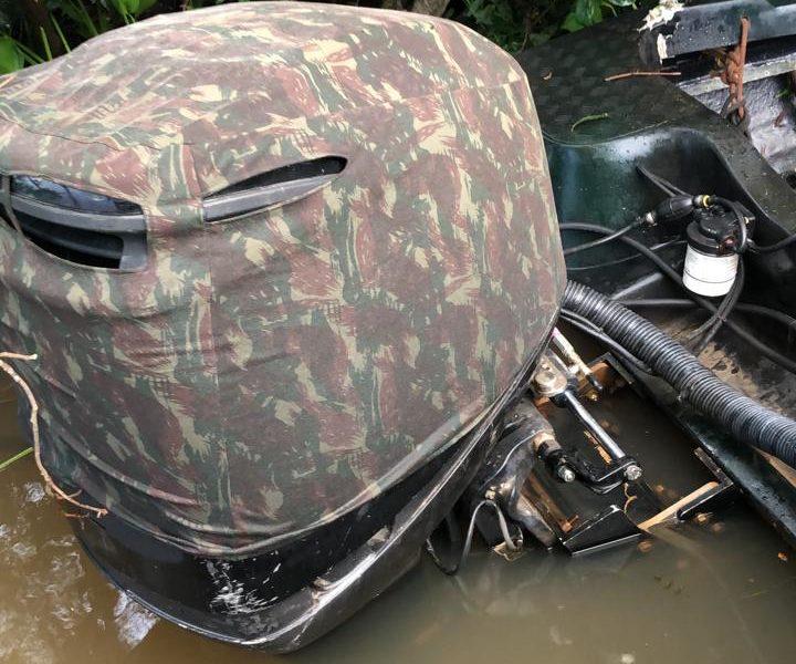 No local foi apreendida uma embarcação de fibra preparada para o transporte de ilícitos equipada com motor 250hp, representando um prejuízo de aproximadamente R$100.000,00 aos criminosos da região.