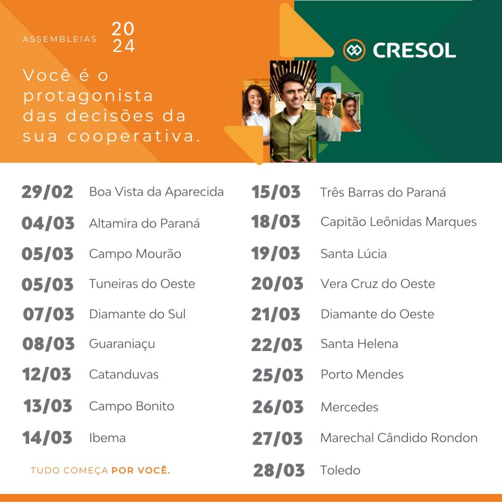 Após as AGRs, no dia 08 de abril será a vez da AGO, que será transmitida ao vivo para os associados por meio da plataforma Assemblex. Confira o cronograma das Assembleias Gerais de Relacionamento, nas quais todas ocorrerão pontualmente às 19h, seguindo o calendário e locais definidos para cada município. É importante ressaltar que, excepcionalmente na cidade de Tuneiras do Oeste, a assembleia do dia 05/03 terá início às 10h, enquanto nas demais cidades permanecerá o horário padrão de 19h.