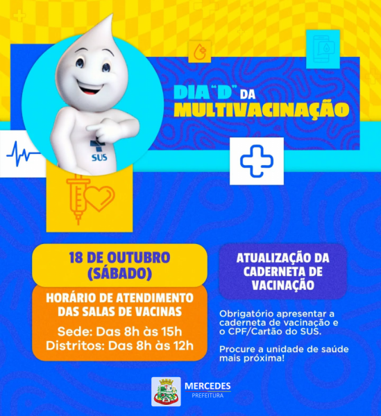 A Secretaria de Saúde de Mercedes realiza neste sábado (18) o Dia “D” da Campanha de Multivacinação 2025, com o objetivo de mobilizar pais e responsáveis para levarem crianças e adolescentes menores de 15 anos às salas de vacina do município.