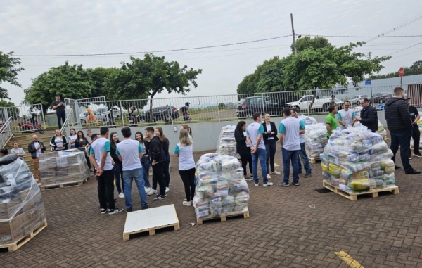 Ao todo foram 80 pallets com alimentos e utensílios além de uma carreta cheia de produtos fornecida pela Copagril para complementar as doações arrecadas ao longo do mês.