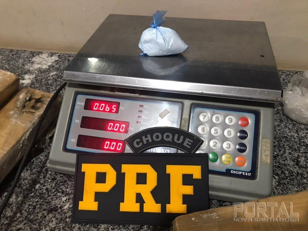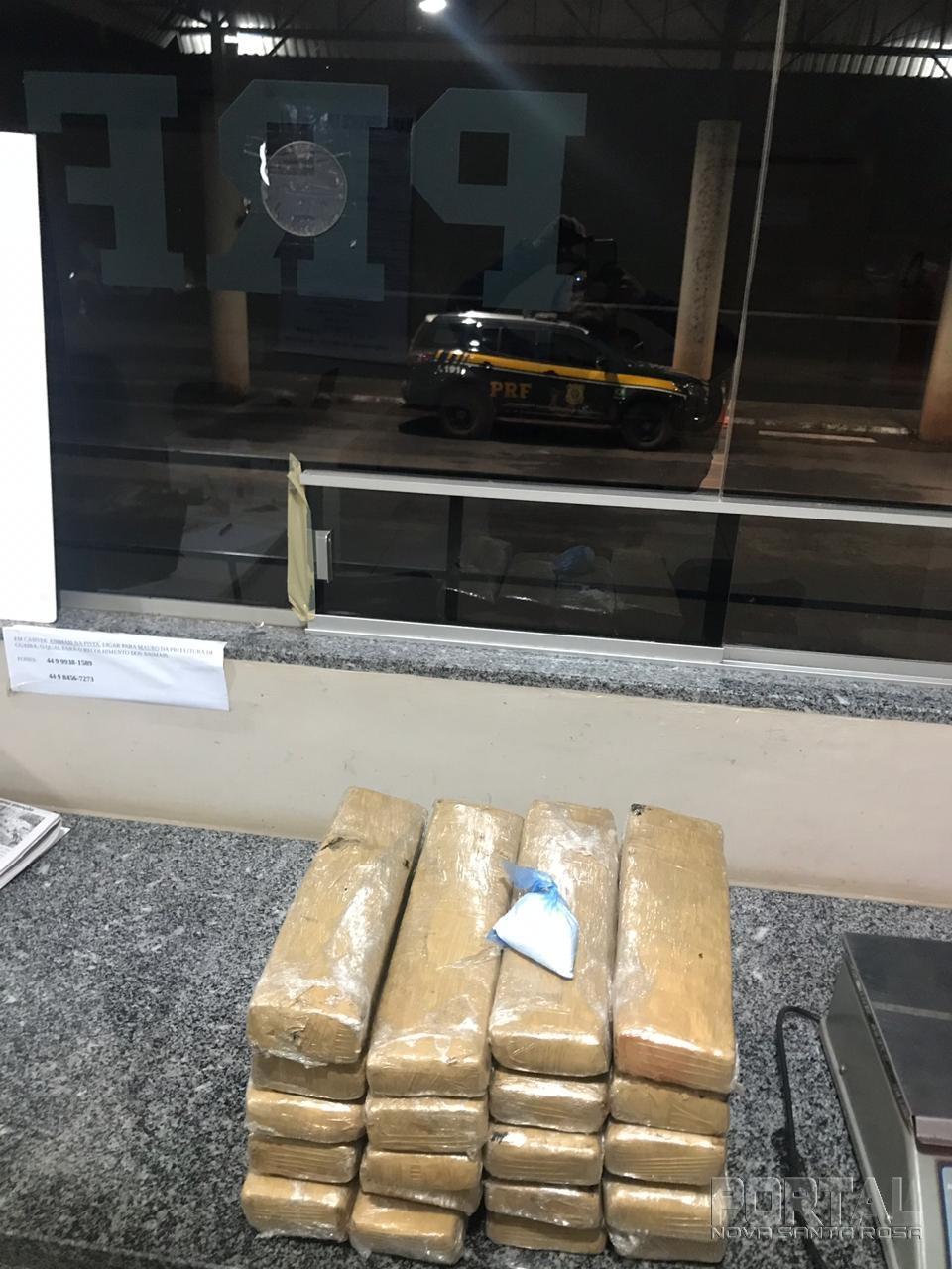 Durante a abordagem, o condutor apresentou nervosismo, o que fez com que os policiais realizassem uma fiscalização minuciosa no veículo, sendo encontrado escondido no interior das duas portas traseiras 20 tabletes de maconha totalizando aproximadamente 19,6 kilogramas e um pacote contendo aproximadamente 65 gramas de cocaína.