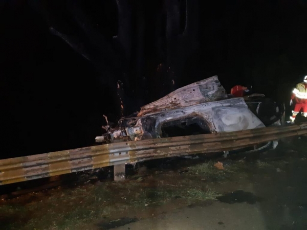 Após sair da rodovia o carro bateu contra uma árvore e pegou fogo. Os dois ocupantes do carro morreram carbonizados.