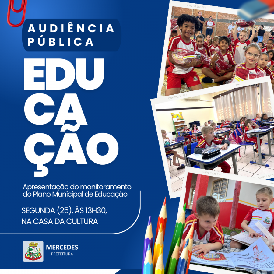 Na próxima segunda-feira (25), a Secretaria de Educação de Mercedes realizará uma Audiência Pública para apresentar o monitoramento do Plano Municipal de Educação. O evento acontece às 13h30, na Casa da Cultura.