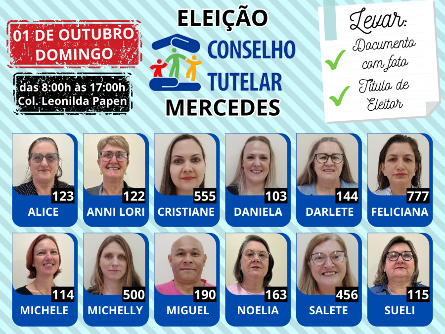 Neste domingo (01), os eleitores do município de Mercedes terão a oportunidade de escolher os novos membros do Conselho Tutelar, órgão responsável pela proteção e defesa dos direitos da criança e do adolescente. A eleição é organizada pelo Conselho Municipal dos Direitos da Criança e do Adolescente (CMDCA) e pela Secretaria de Assistência Social, com o apoio da Administração Municipal de Mercedes.