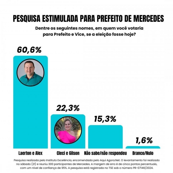 O levantamento foi realizado no último sábado (21) e reuniu 300 participantes de Mercedes. A margem de erro é de cinco pontos percentuais, com um nível de confiança de 95%. A pesquisa está registrada no Tribunal Superior Eleitoral (TSE) sob o número PR-07146/2024.