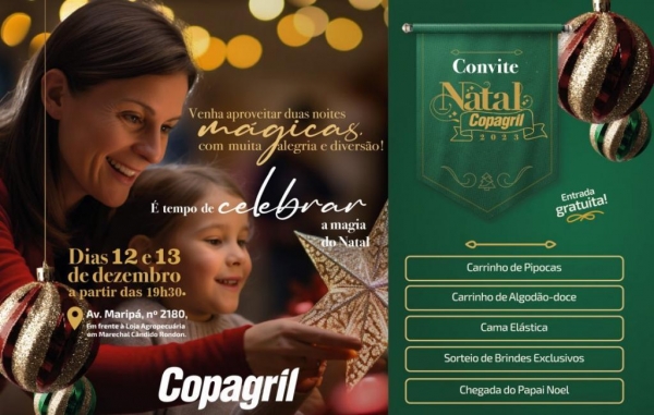 A Cooperativa Agroindustrial Copagril realizará, nos dias 12 e 13 de dezembro, a primeira edição do evento "Natal Copagril", que acontecerá a partir das 19h30, em frente à Loja Agropecuária Copagril, em Marechal Cândido Rondon.