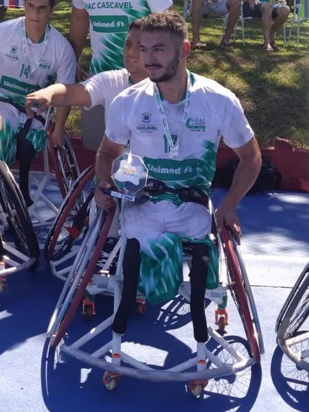 Dione é para-atleta da APAC – Cascavel, disputando competições de basquete e handebol sobre cadeiras de roda no Paraná e no Brasil. Ele já atua na equipe há três anos.