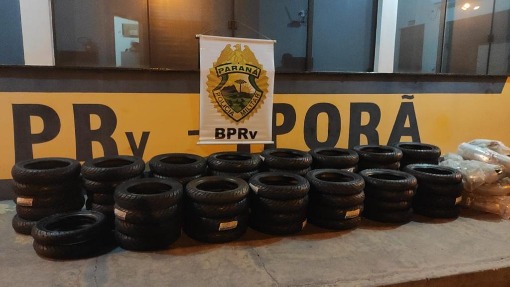 Ao vistoriar o compartimento de carga foram encontrados ainda vários pneus e acessórios totalizando 66 e 65 paralamas para motos.