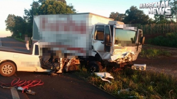 A colisão envolveu uma pick up Saveiro, com placas AJP-3367, de Quatro Pontes – ocupada por duas pessoas; e um Caminhão Ford Cargo, de Mercedes, de propriedade de um supermercado daquela cidade.