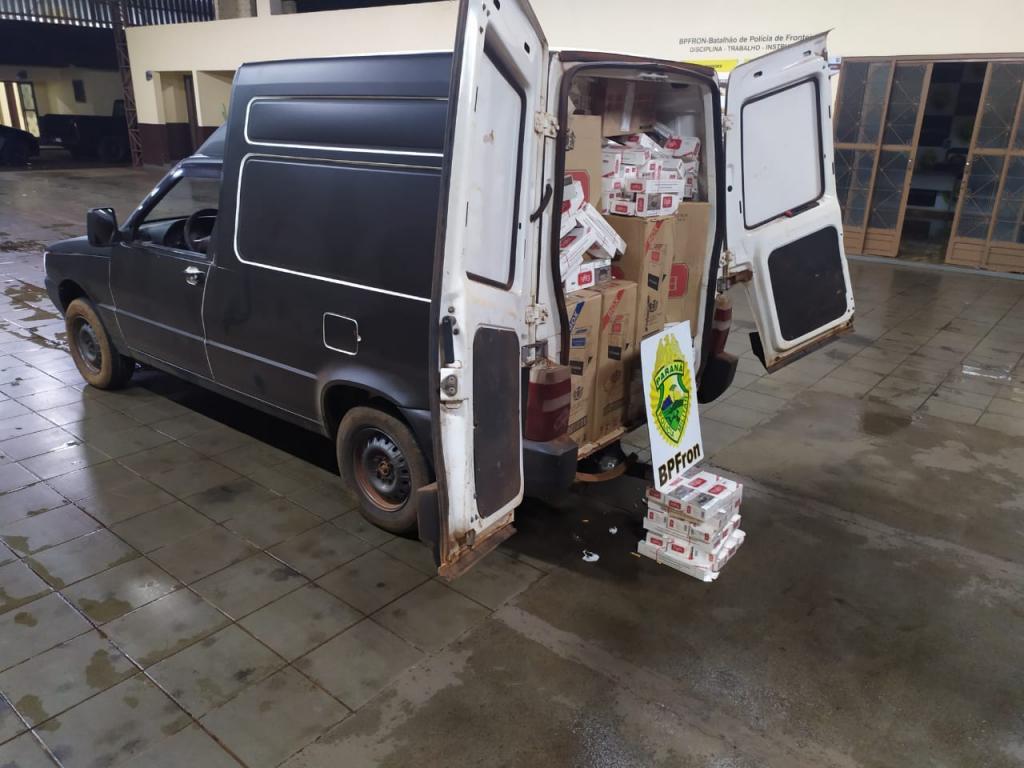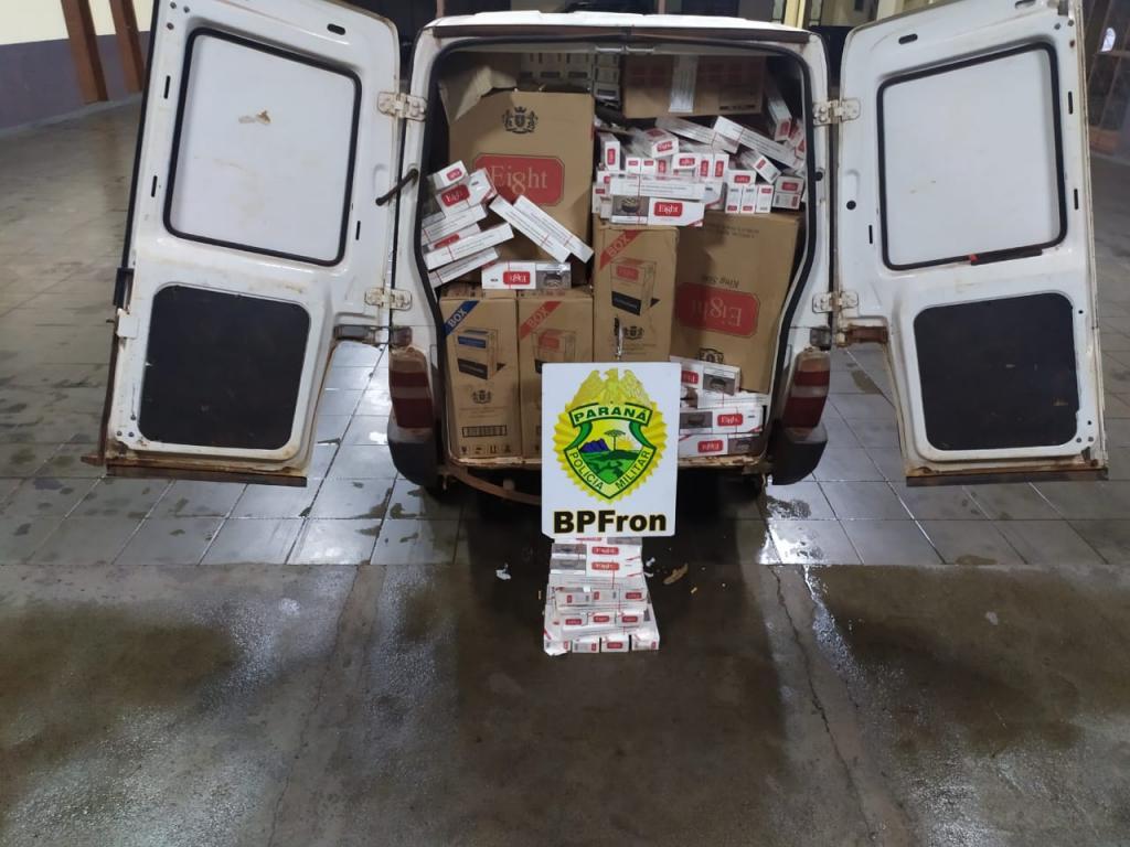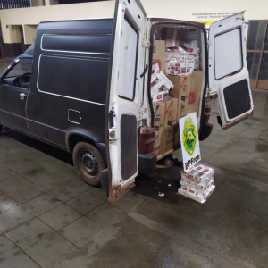Após revista, foi constatado que o veículo estava carregado com aproximadamente 1.500 (mil e quinhentos) pacotes de cigarros de origem estrangeira.