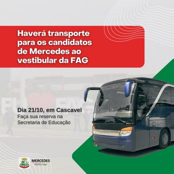 A Secretaria de Educação de Mercedes disponibilizará transporte gratuito para os candidatos ao Vestibular do Centro Universitário FAG que será realizado no dia 21 de outubro, em Cascavel.