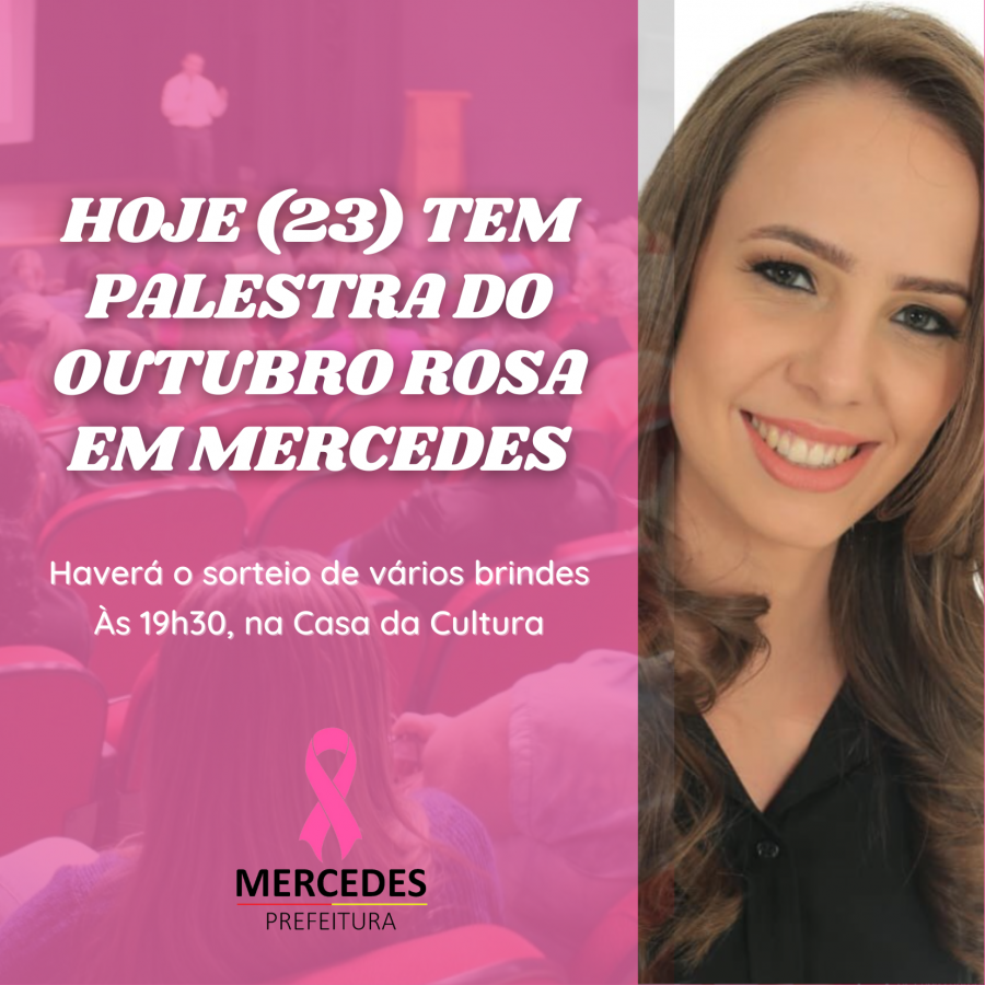 Vária ações estão sendo realizadas pela Secretaria de Saúde de Mercedes ligadas ao Outubro Rosa, mês dedicado a prevenção e detecção precoce do câncer de mama. Hoje (23), será realizada uma palestra na Casa da Cultura, às 19h30, ministrada pela Ginecologista e Obstetra Dra. Erica Lourenço, com o tema "Saúde da Mulher".
