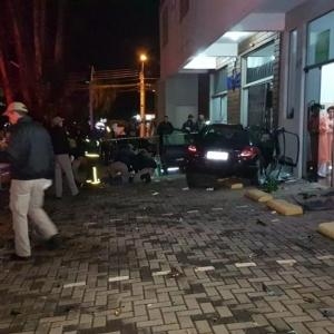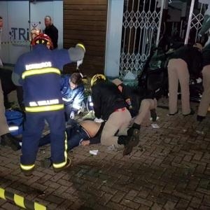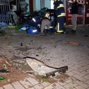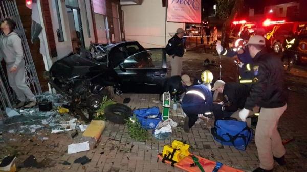 O carro invadiu a calçada, batendo de raspão contra uma árvore, atingindo a estrutura de uma academia.