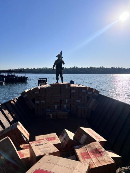 A embarcação, de fabriacação artesanal, transportava 12500 pacotes de cigarros, equivalente à 250 caixas de cigarros. Tudo foi apreendido e também encaminhado à PF.