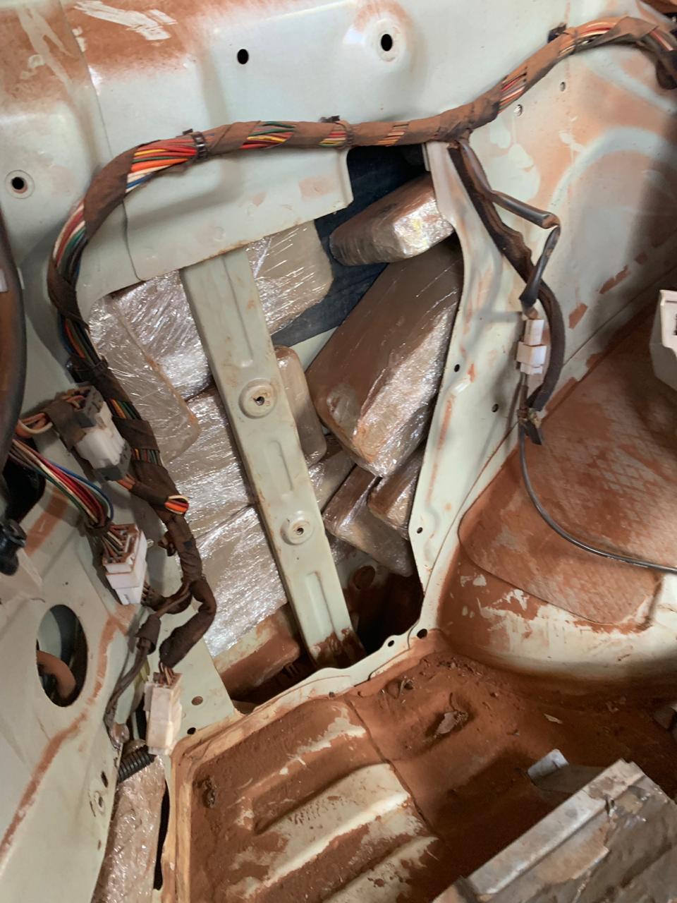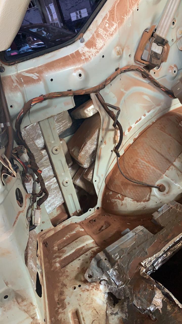 Ontem, durante ação da Operação Hórus Sul Policiais Militares do BPFron em conjunto com agentes da Receita Federal do Brasil e Força Nacional com apoio do Ministério da Justiça Secretária de Operações Integradas - SEOPI em abordagem ao condutor de 35 anos, que dirigia um carro Kia Sorento, durante busca no veículo foi identificado um fundo falso contendo diversos tabletes totalizando 200 kg de maconha.