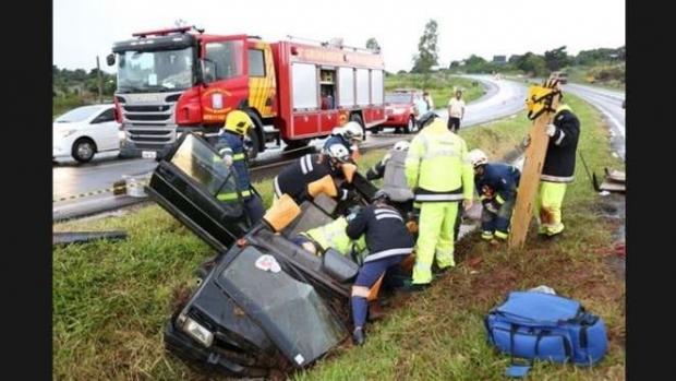 Para retirar a vítima do carro, a lataria do VW Gol precisou ser cortada pela equipe de socorristas.