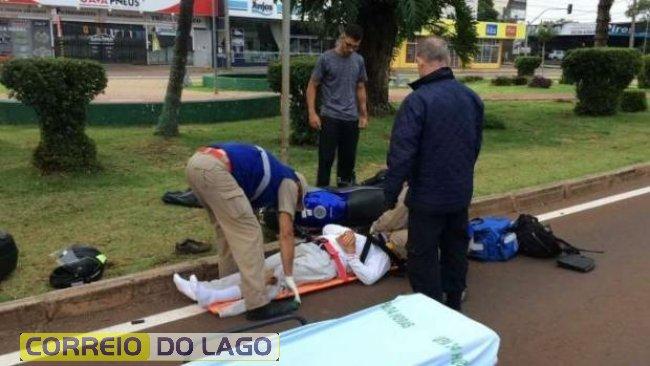 Um homem ficou ferido ao sofrer queda de moto na Avenida Brasil cruzamento com a Rua Rafael Picoli em Cascavel, na manhã deste domingo (23).