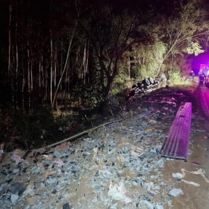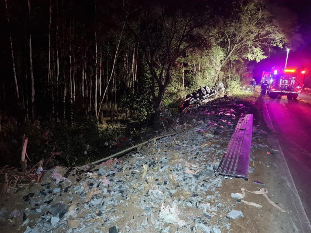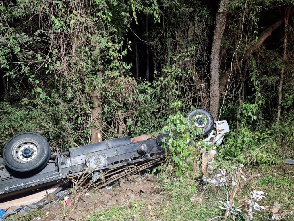 A Polícia Rodoviária Estadual atendeu a ocorrência e relatou que o condutor do caminhão que até o momento não identificado, morreu no local, o caminhão, um Ford Cargo 2428 ficou com as rodas para cima.