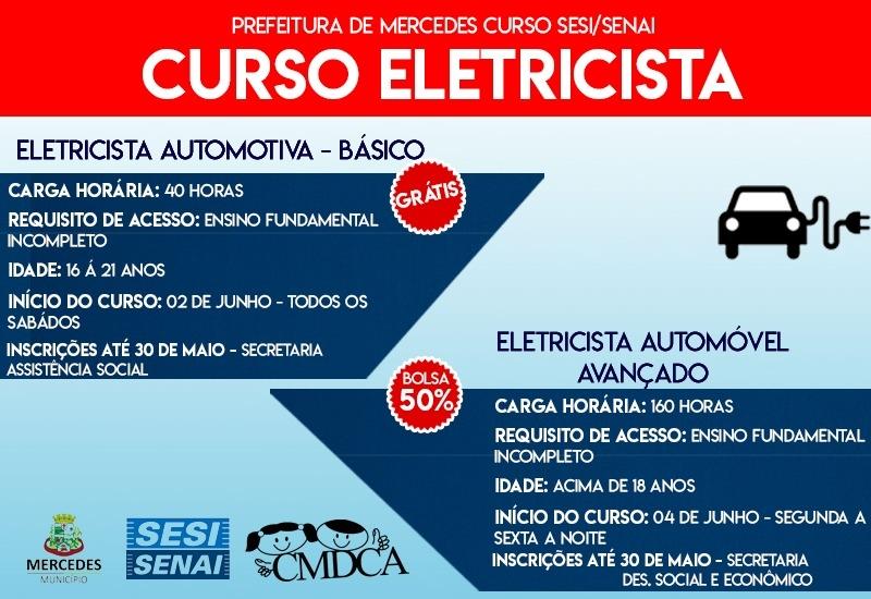 O curso de eletricista automotivo básico é gratuito e tem início programado para 02 de junho. O requisito de acesso é ter o ensino fundamental e idade entre 16 a 21 anos. As aulas vão ocorrer aos sábados pela manhã em uma carga horária total de 40h.