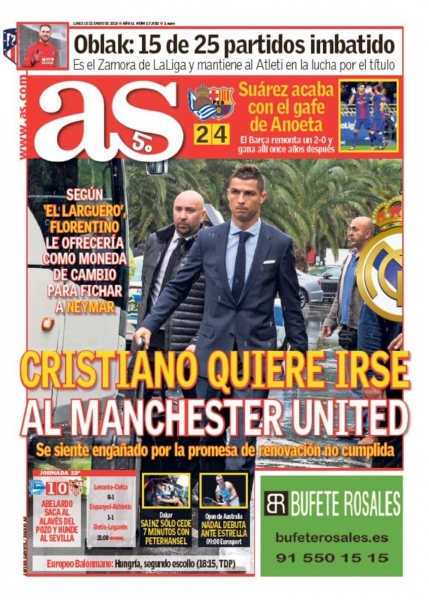 Cristiano Ronaldo também não fala, há tempos, a mesma língua do presidente Florentino Pérez e estaria se sentindo "enganado pela promessa de renovação não cumprida". Apesar dos títulos recentes e dos cinco prêmios de melhor jogador do mundo, o português tem "apenas" o quinto maior salário do mundo - Messi, Neymar, Oscar e Lavezzi são os que recebem mais.