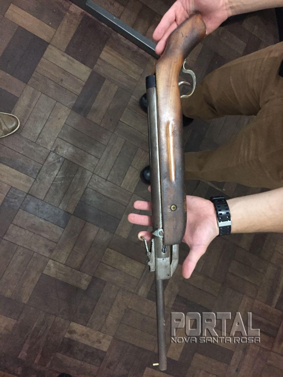 A arma usada no crime, havia informações de que foi jogada em um terreno, policiais encontraram a espingarda calibre 22 adaptada.