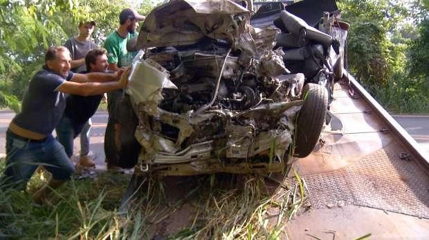 O impacto foi tão forte que arrancou o teto do Celta, com a batida o caminhão em seguida bateu contra o barranco.