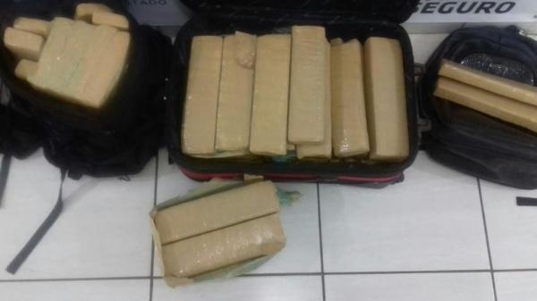 Após buscas nos pertences, foram encontrados 36,56 quilos de maconha, separados em três bolsas de viagem.