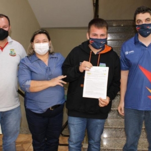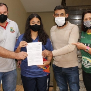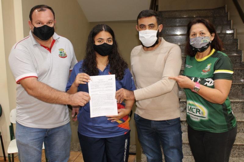 Evento realizado nesta segunda-feira (14) na prefeitura de Mercedes marcou a assinatura dos contratos do Programa Geração Olímpica, para 20 atletas do município. O ato contou com a participação do prefeito Laerton Weber, do Secretário de Esporte, Lazer e Turismo Henrique Endler (Ique), professores da modalidade de handebol Marlon Neves e Catarina Petri, pais/responsáveis e atletas beneficiados.