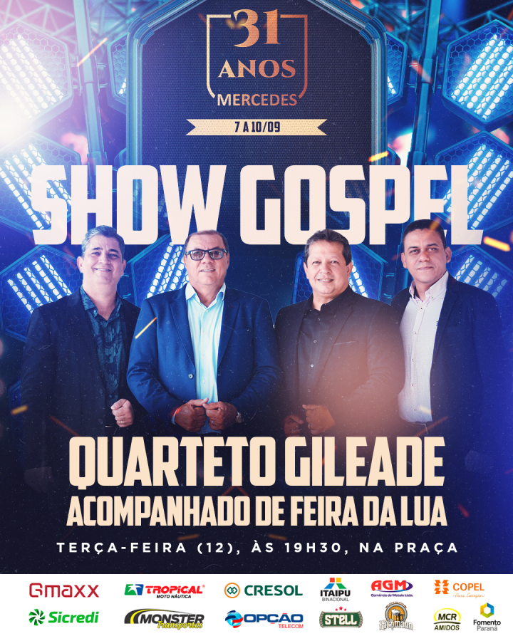 Integrando a programação de 31 anos de Mercedes, acontece na noite desta terça-feira (12), véspera do aniversário do Município, o Show Gospel com o renomado Quarteto Gileade e a Feira da Lua. O evento acontecerá na praça central a partir das 19h.