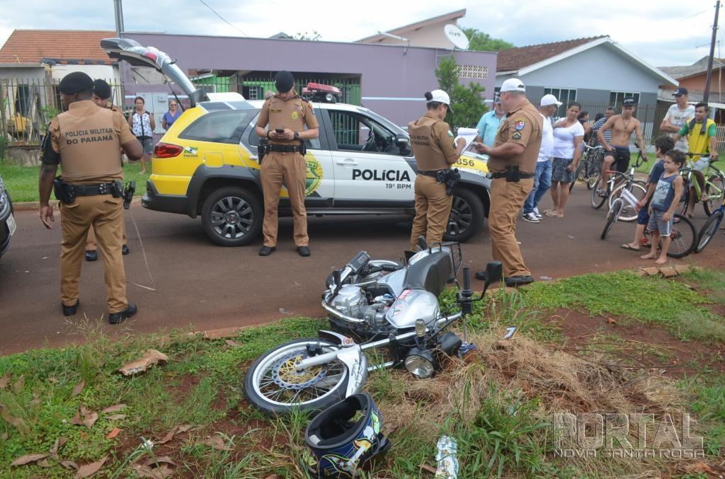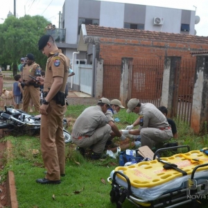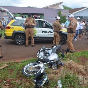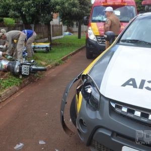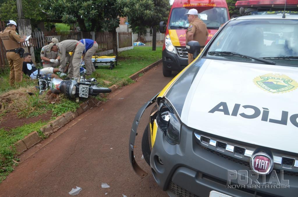Um acidente entre uma moto e uma viatura da Polícia Militar foi registrado por volta das 15h40 de hoje, no bairro São Francisco, na região do Jardim Cromam 2 e envolveu uma moto CG 150 cilindrada, placa ANX 8304 de Toledo, conduzida por Alex Rafael de Oliveira Máximo, de 18 anos e uma viatura da Polícia Militar, placas BBZ 5721 do estado do Paraná, conduzida pelo soldado Venturin.
