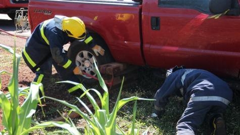 O corpo do motociclista ficou enroscado embaixo da camioneta, dando trabalho para a remoção feita pelos bombeiros de Campo Mourão.