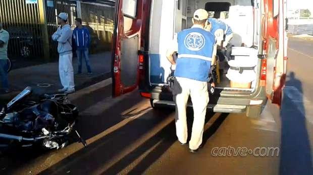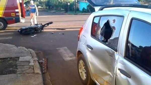 A manhã de sexta-feira (23), começou com um acidente grave, no Bairro Brasmadeira, em Cascavel. O veículo Sandero seguia pela Rua Salvador quando foi atingido na lateral pela motocicleta, no cruzamento com a Ganhi.