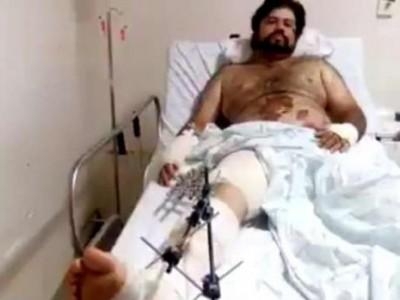 Ele sofreu quatro fraturas na perna, rompimento do tendão e perda do movimento em uma das mãos. No corpo diversas queimaduras do asfalto.