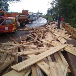 O veículo estava carregado com madeira e a carga ficou espalhada pela rodovia após o acidente.
