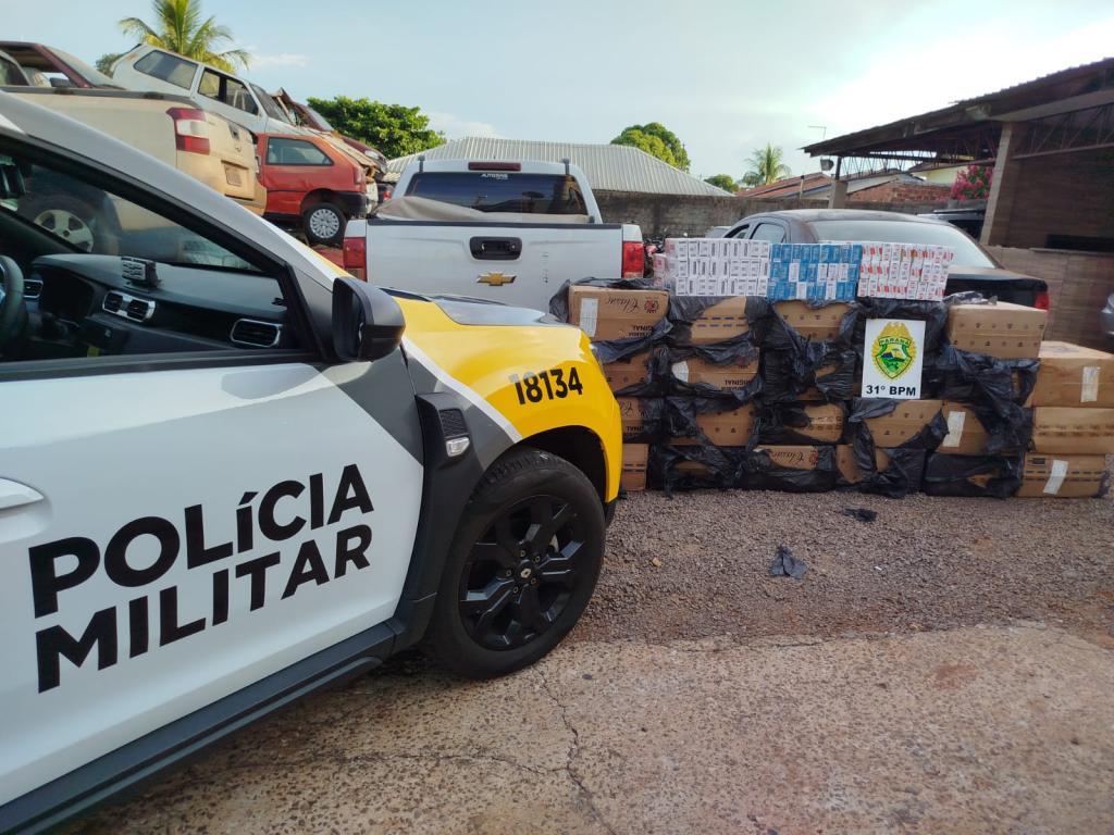 Durante a verificação no imóvel, foram encontrados dois veículos utilizados no transporte dos produtos — um VW Voyage e uma Chevrolet S10 — além de diversas caixas de cigarros de marcas variadas e rádios comunicadores.