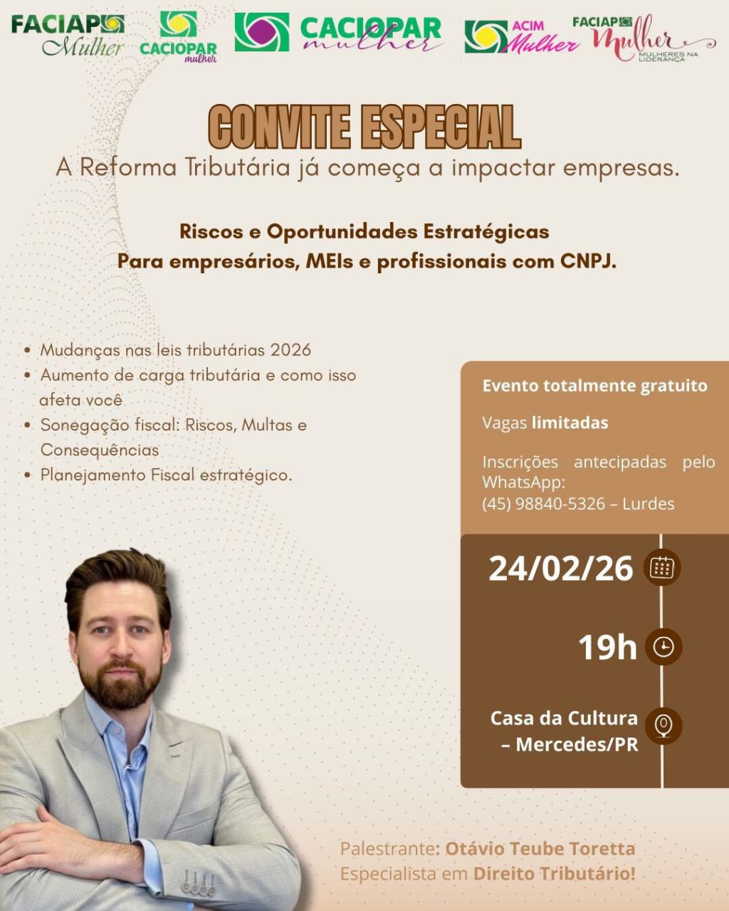 Empresários, microempreendedores individuais (MEIs) e profissionais com CNPJ terão a oportunidade de esclarecer dúvidas sobre a Reforma Tributária e as novas regras do Imposto de Renda em uma palestra que será realizada na próxima terça-feira, dia 24 de fevereiro, às 19h, na Casa da Cultura, em Mercedes.