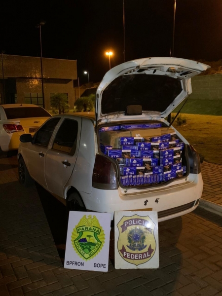 A ação integrada entre POLÍCIA FEDERAL, BPFRON e BOPE da PMPR resultou na apreensão de 01 veículo FIAT PALIO carregado com aproximadamente 15.000 carteiras de cigarros contrabandeados do Paraguai, acarretando um prejuízo total estimado de R$ 100.000,00 (cem mil reais) ao crime organizado.