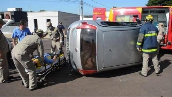 Um Fiat Palio tombou após um acidente entre dois carros no Centro de Toledo na manhã desta quarta-feira (04).