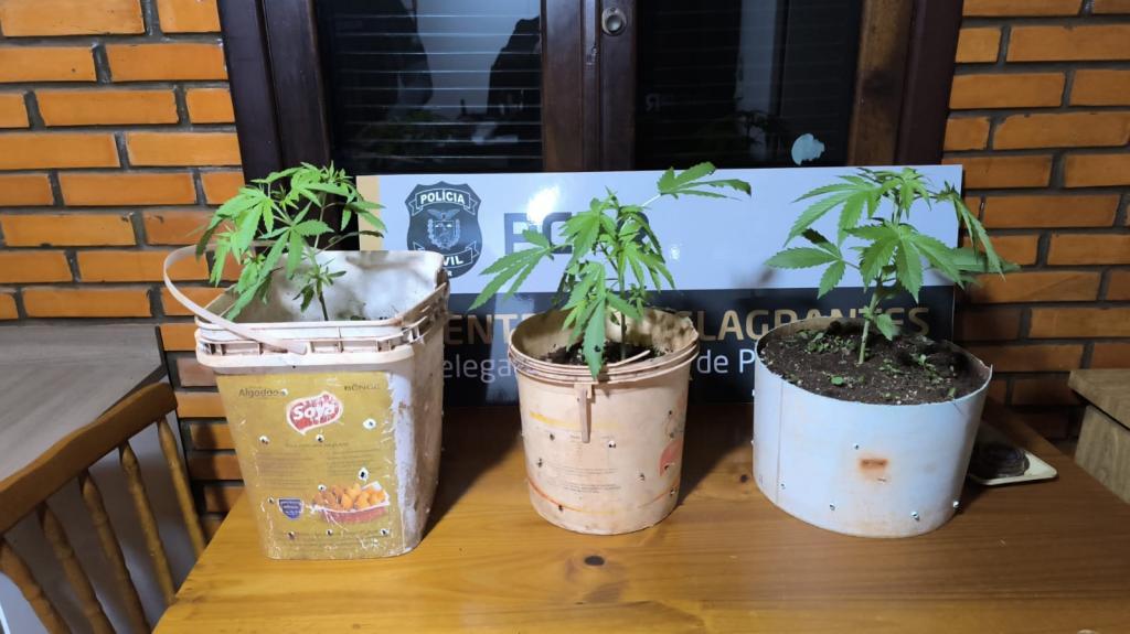 Após receber denúncia anônima que haviam três pés de maconha na antiga Piscina Tropical em Palotina, a equipe da Polícia Civil foi até a rua Glauber Rocha s/n, onde se encontrava uma senhora, nos fundos da residência foram localizados três vasos contendo plantas de maconha, bem como no interior de um dos quartos foram localizados seis (06) embalagens de sementes de maconha.