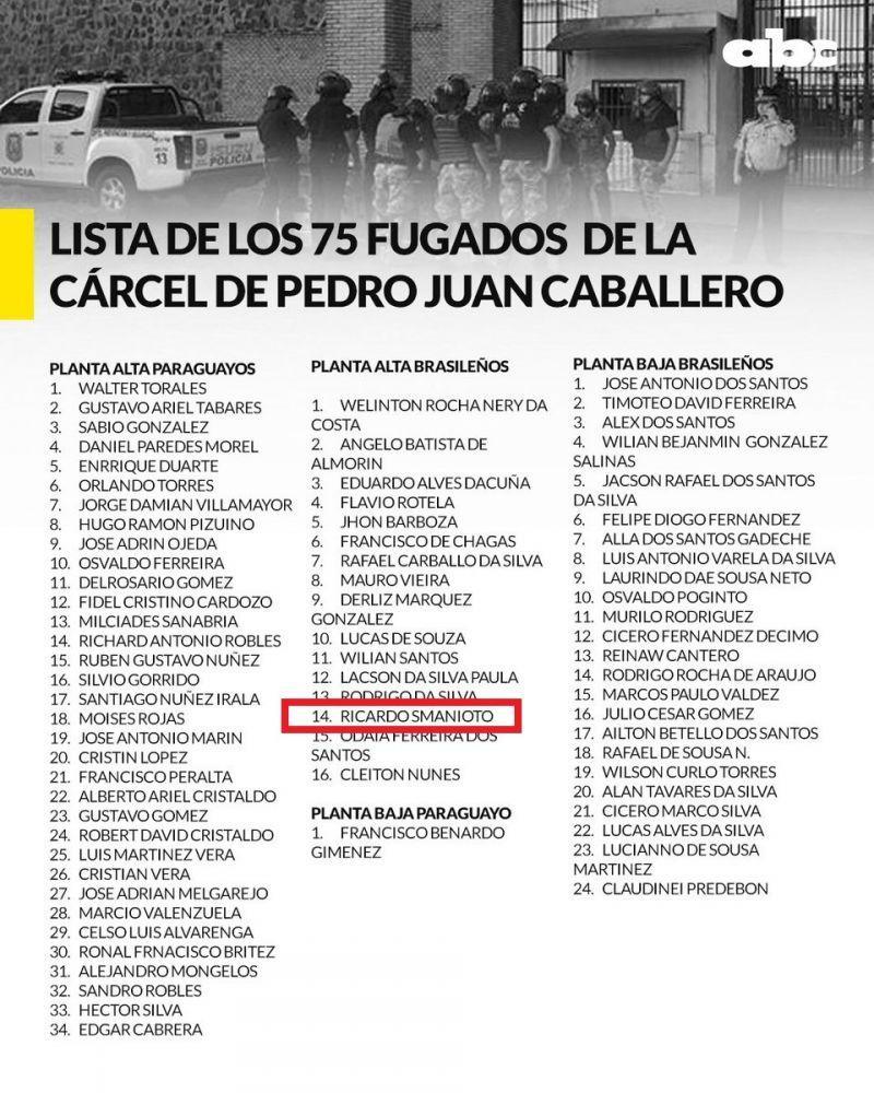 A ministra da Justiça do Paraguai, Cecilia Perez, informou pela manhã que 91 presos conseguiram escapar da prisão por volta das 4h (3h, em Ponta Porã) e disse que eles são integrantes do Primeiro Comando da Capital (PCC). Mais tarde, a procuradora Reinalda Palacios declarou que o número de fugitivos foi atualizado para 75, de acordo com o jornal "ABC Color".