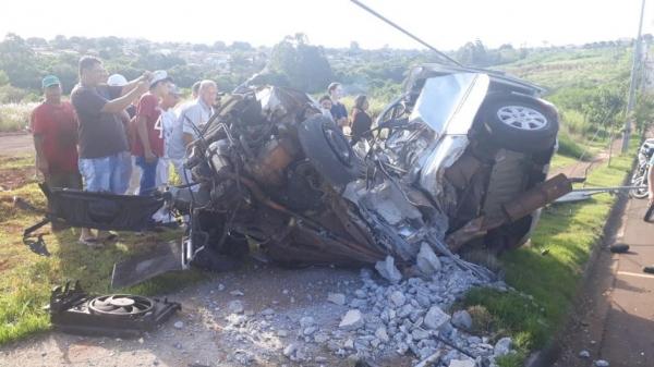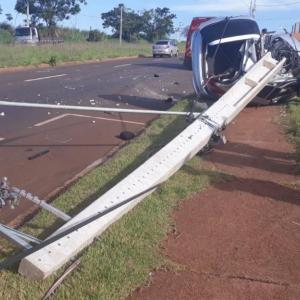 Com a força do impacto, o Peugeot praticamente abraçou o poste, que foi arrancado, sendo que os dois (carro e poste) ficaram destruídos.