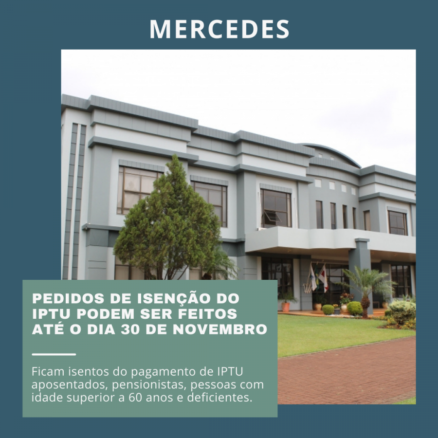 Os contribuintes de Mercedes que tiverem direito à isenção do Imposto Predial e Territorial Urbano (IPTU) têm até o dia 30 de novembro de 2023 para procurar a Prefeitura e protocolar o pedido. As pessoas que já se beneficiaram em anos anteriores, devem realizar novamente o pedido para ter direito ao benefício no próximo ano.