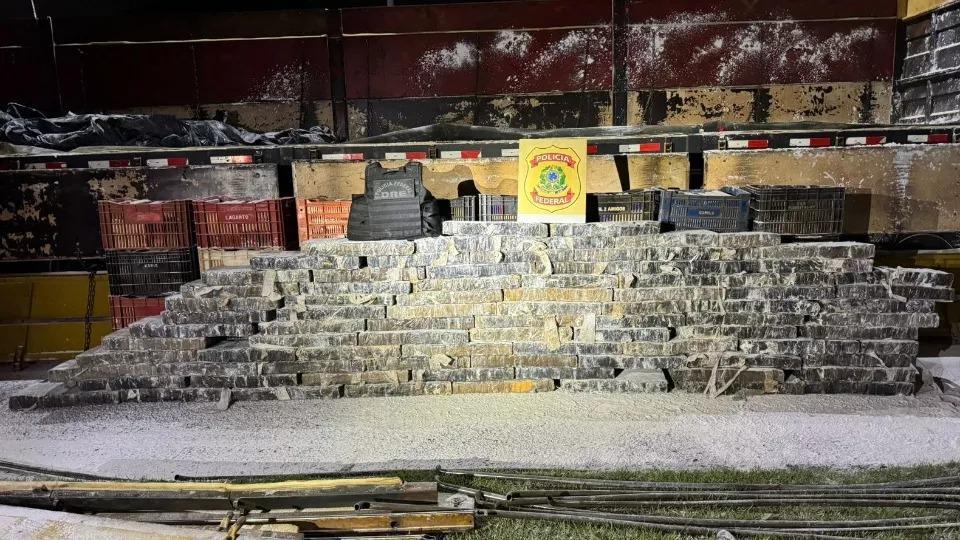 A droga estava oculta sob um assoalho de madeira, camuflada com um pó branco para dificultar a detecção durante a fiscalização.