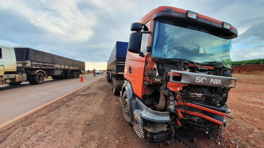 Com o impacto da batida, o motorista do caminhão perdeu o controle da direção, atravessou a pista, e só conseguiu parar no acostamento da rodovia. Ele não se feriu.