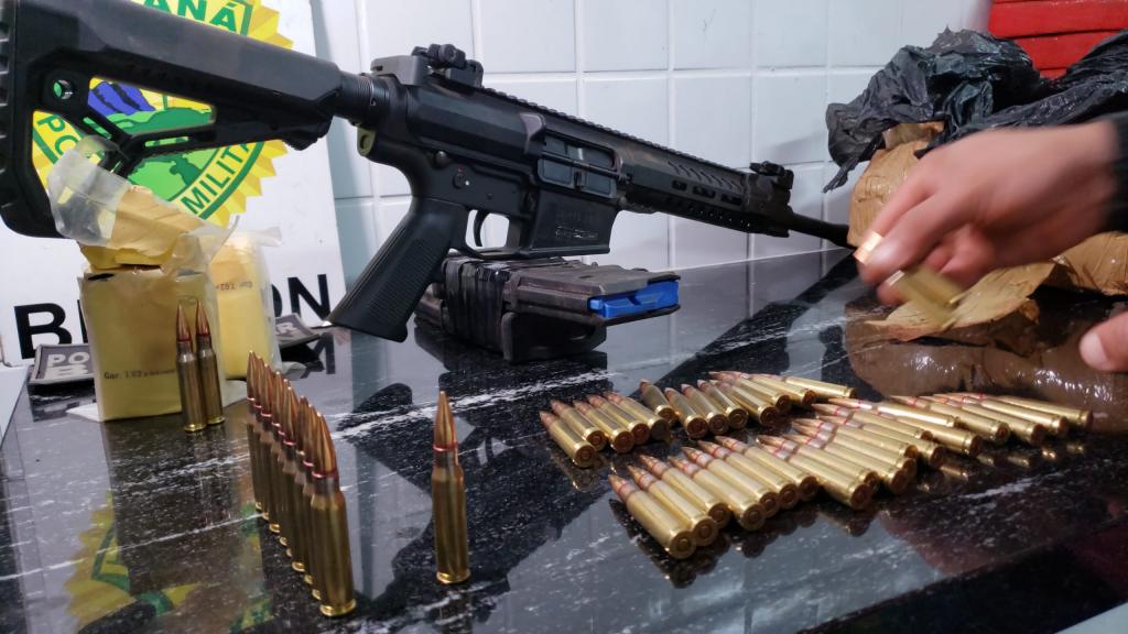 A Polícia Militar retirou de circulação arma de fogo, munições e grande quantidade de drogas, na madrugada desta terça-feira (21). Um veículo Fiat Toro foi apreendido com quase uma tonelada de maconha além de um fuzil e diversas munições, durante ação policial na rodovia BR-163, em Santa Tereza do Oeste.