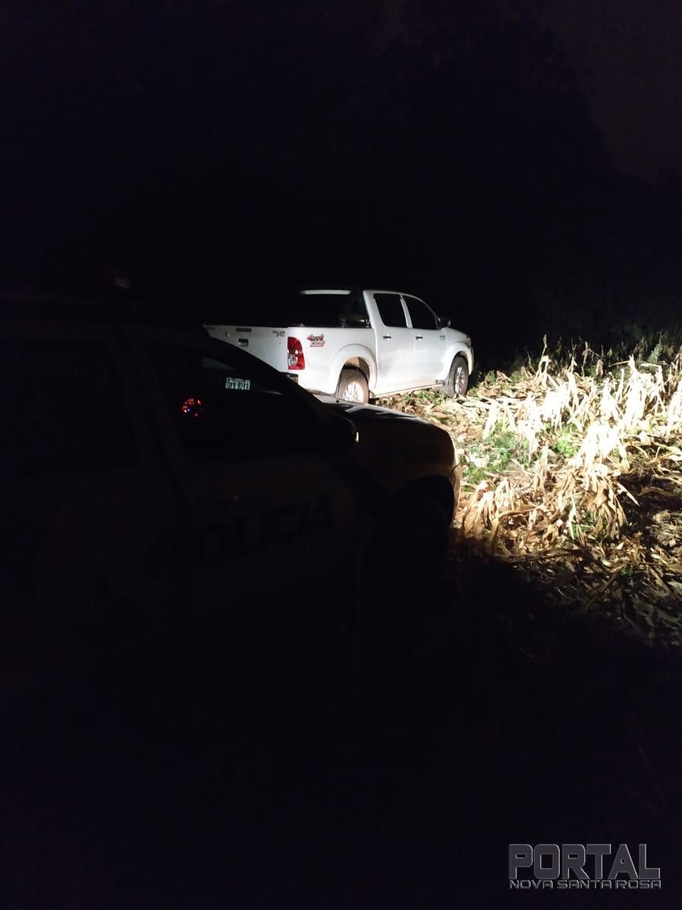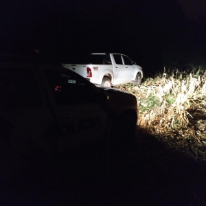 Os policiais militares foram acionados e saíram em diligências nas imediações e por volta das 21h50 em patrulhamento localizaram no prolongamento da rua Elias Montoreanu em meio a uma plantação de milho a caminhonete roubada.