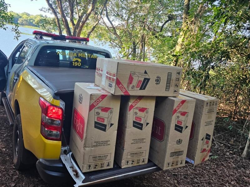 Segundo a PM, durante um patrulhamento, os policiais localizaram cinco caixas de cigarros, totalizando 250 pacotes de origem estrangeira, escondidos em um canto da mata próximo a um porto clandestino no Lago de Itaipu.