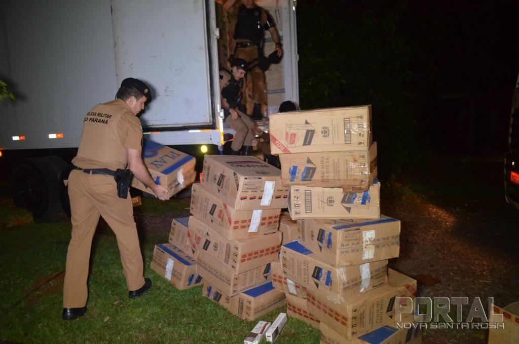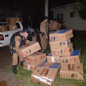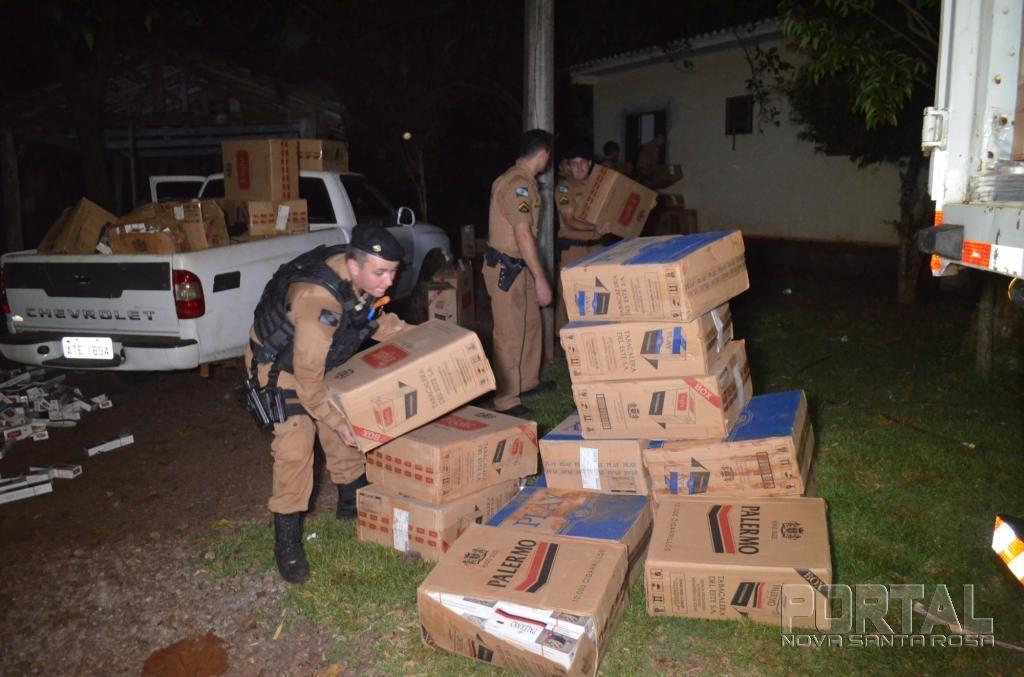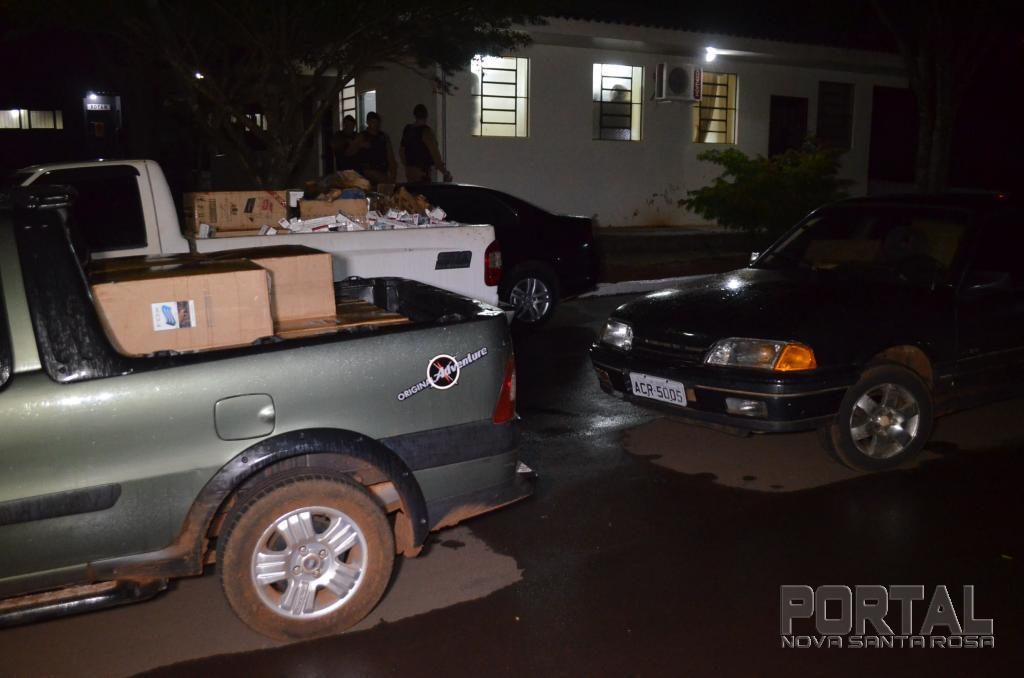Por volta das 21h30 de ontem (10), na rua Guarani, Vila Becker, em rápida ação de inteligência, policiais chegaram no endereço onde estaria sendo armazenado produto de contrabando. No local, foi constatado 03 veículos, GM Monza, placas ACR-5005, um FIAT Strada, placas AFZ-3838, uma camioneta GM S10, placas ATE-1894 e 03 caminhões, totalizando 313 caixas de cigarros oriundos do Paraguai.