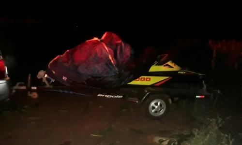 Por volta das 20h30 de ontem (11), uma equipe recebeu informações de outros policiais que estavam de folga, de que três indivíduos iriam transportar um jet-ski de cor amarela até a cidade de Pato Bragado, sendo tal moto aquática oriunda de furto na madrugada desse mesmo dia. Os policias no dia de folga, apaisanas e em veículo particular, ajudaram nas diligencias, e em dado momento avistaram o veículo Ford Ecosport de cor prata placas, engatado em um reboque com a referida moto aquática. Iniciado o acompanhamento tático e repassando informação a equipe de serviço, foi feita a tentativa de abordagem pela equipe ao veículo onde o mesmo tentou fugir, embreando-se em uma plantação de milho. Após percorrer um grande trajeto pela lavoura, a equipe visualizou dois indivíduos, sendo um deles o motorista, abrindo a porta e fugindo a pé pela lavoura, onde o veículo, ainda em movimento, continuou o trajeto parando alguns metros à frente. Feita a abordagem no indivíduo que estava no banco do carona na frente, e feito busca no veículo localizando no lado do motorista e na porta uma carteira com documentos e cnh do indivíduo que conduzia o veículo e fugiu. Foi constatado que a moto aquática Seadoo rxt 260hp de cor amarela é a mesma furtada na madrugada. A equipe de serviço juntamente com os policias de apoio fez busca no milharal afim de localizar os outros dois indivíduos, porém sem êxito, No local ainda houve um grande dano a lavoura de milho de proprietário ainda não identificado para avaliar os danos causados. O indivíduo e o veículo Ecosport de propriedade de seu pai, juntamente com o produto de furto, foram encaminhados a delegacia local para providencias cabíveis.