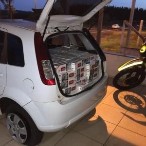 Após vistoriar o veículo, foram localizados, em seu interior e porta malas, aproximadamente seis mil maços de cigarros das marcas Eight e Palermo, oriundos do Paraguai.